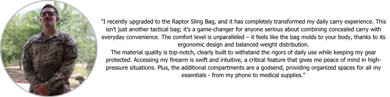 In summary, the Raptor Sling Bag is much more than just a means to carry a concealed weapon. It's a testament to living a life prepared, a nod to my past in the military, and a tool in my present as a farmer and father. It's durable, practical, and discreet - everything I need as I juggle my roles. Highly recommend it to anyone who values functionality, comfort, and preparedness in their everyday carry."